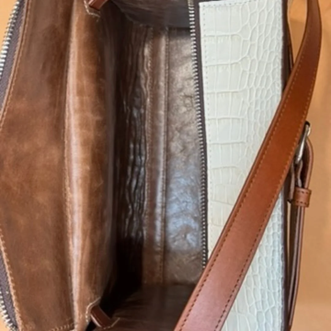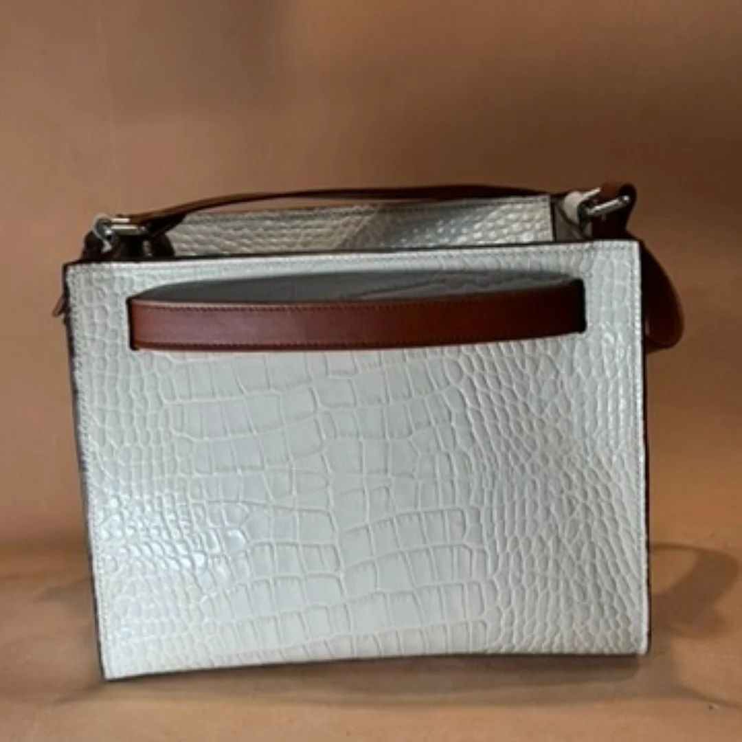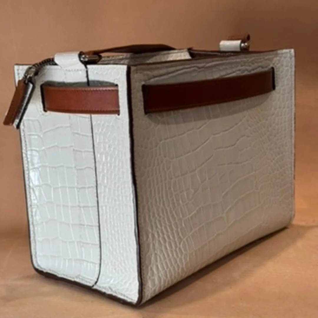 El bolso BERTA es una creación única elaborada artesanalmente con piel de máxima calidad, tanto en su exterior con grabado efecto cocodrilo como en su interior, donde se aprecia el acabado natural del cuero auténtico.